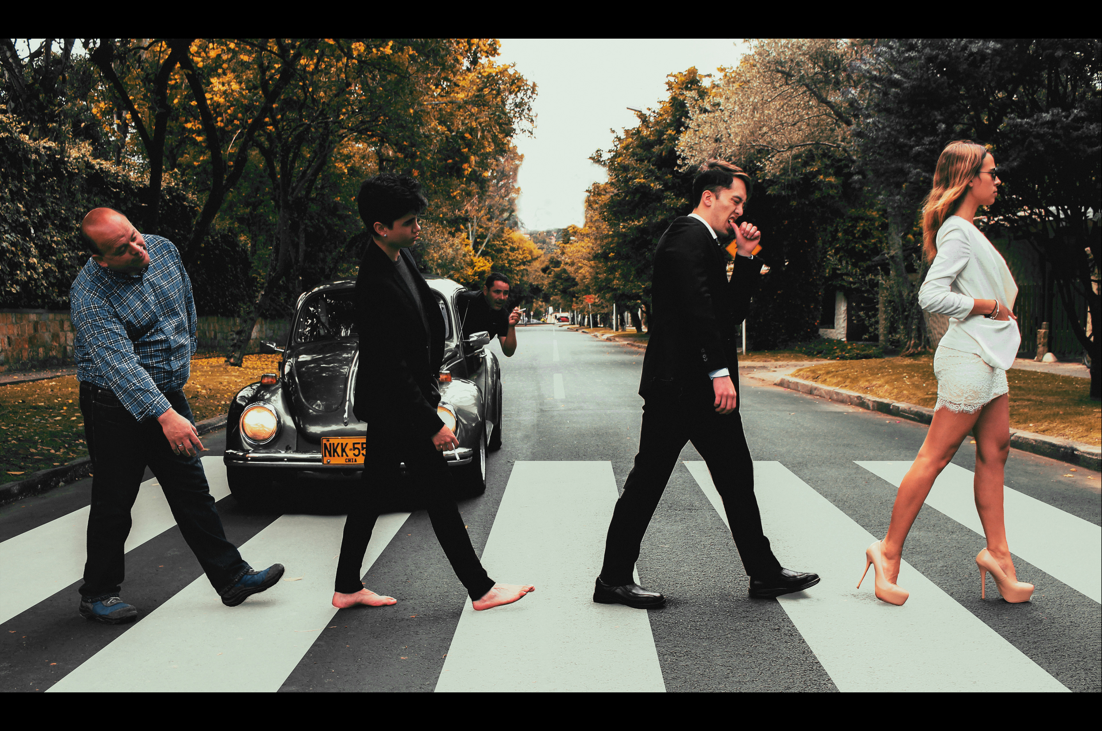 En este caso, se escogió el cliché del hombre moroso y vulgar, y el comportamiento habitual latinoamericano de cosificar a la mujer. En la foto recreada, además de los personajes principales, existe una quinta persona dentro de un volkswagen que va distraído mirando a la mujer que camina de blanco. El carro va dirigido hacía los hombres que se encuentran pasando la calle, por la dirección del carro y por la falta de atención del conductor, se entiende que estos van a perder la vida en los próximos instantes.