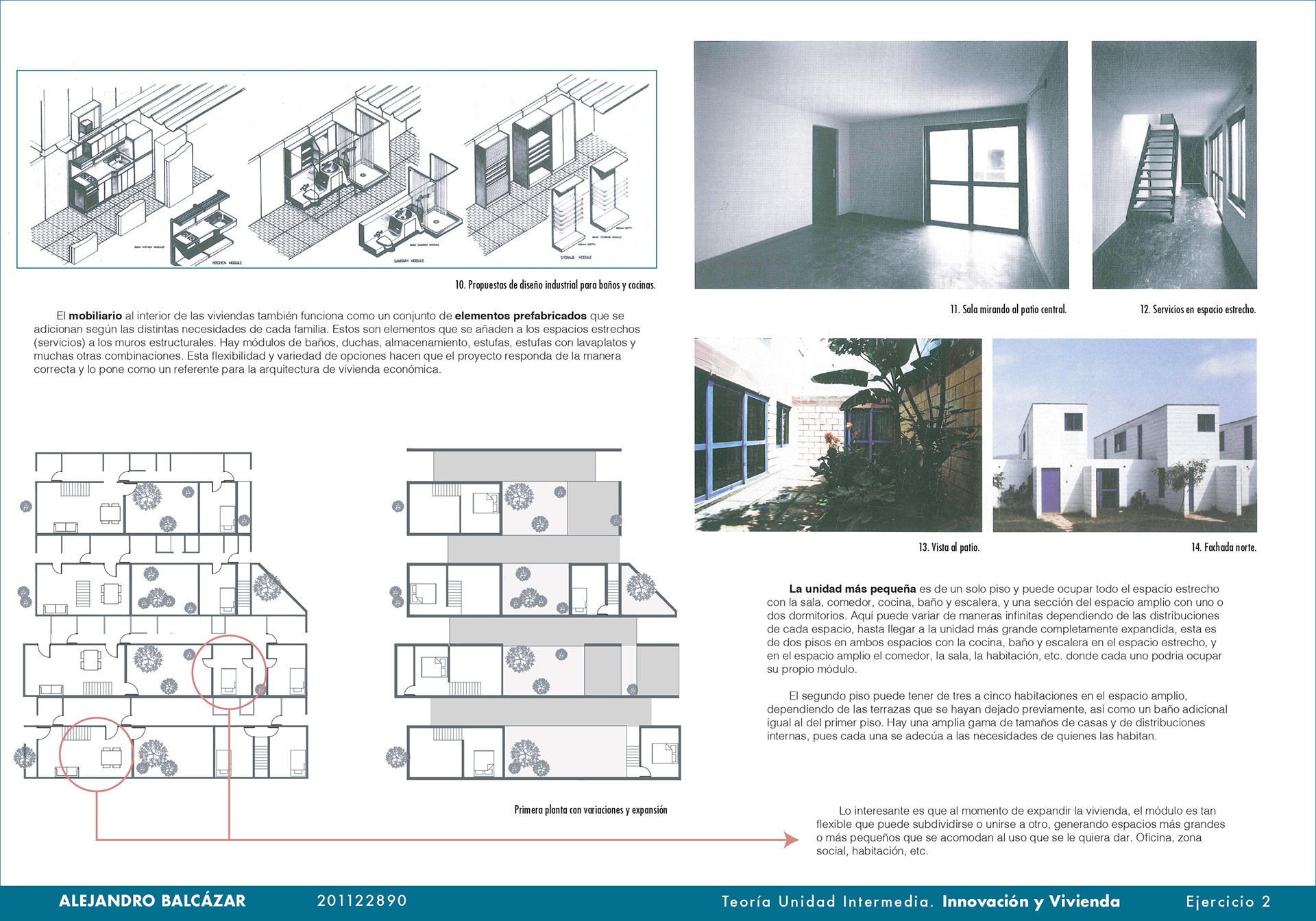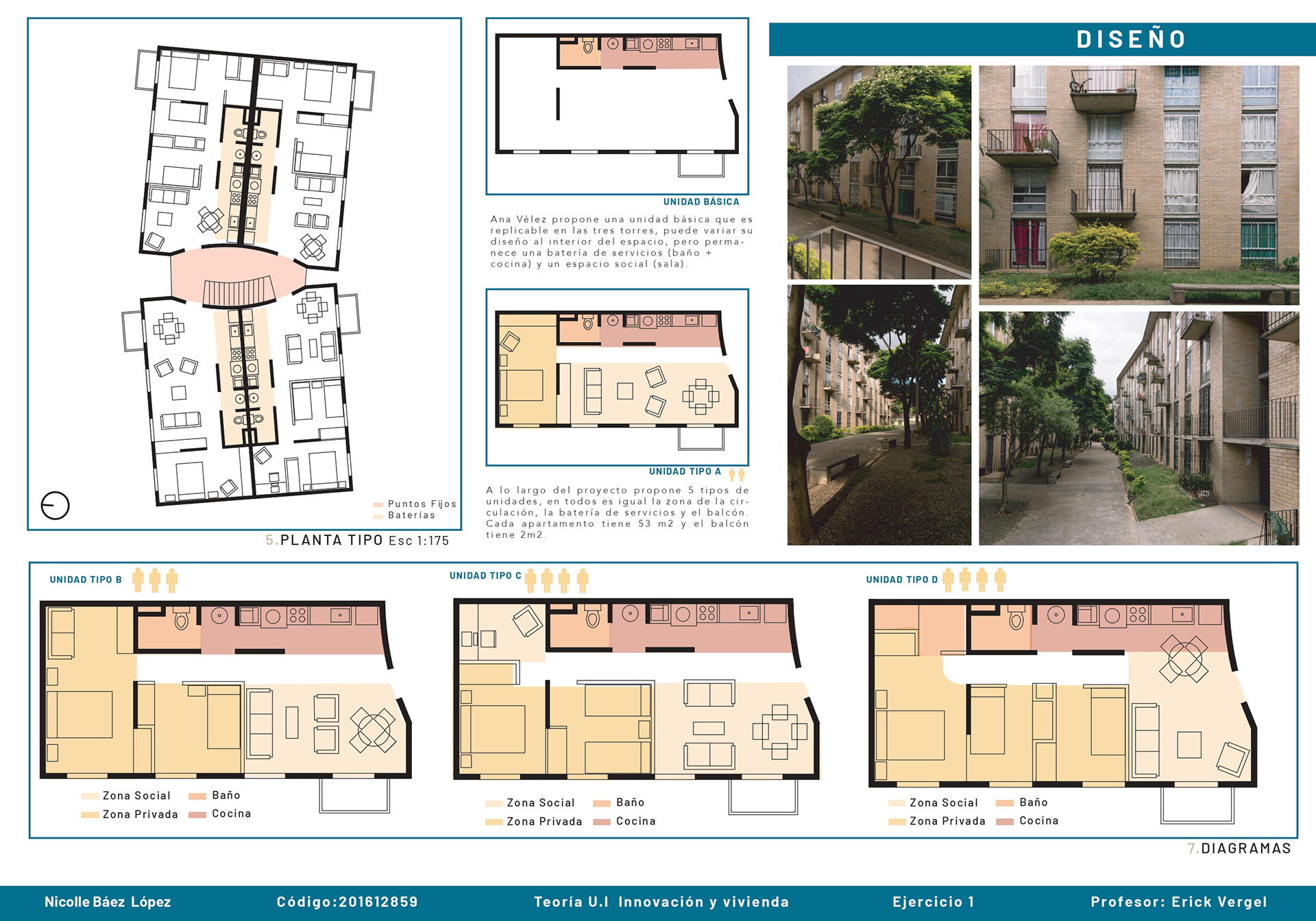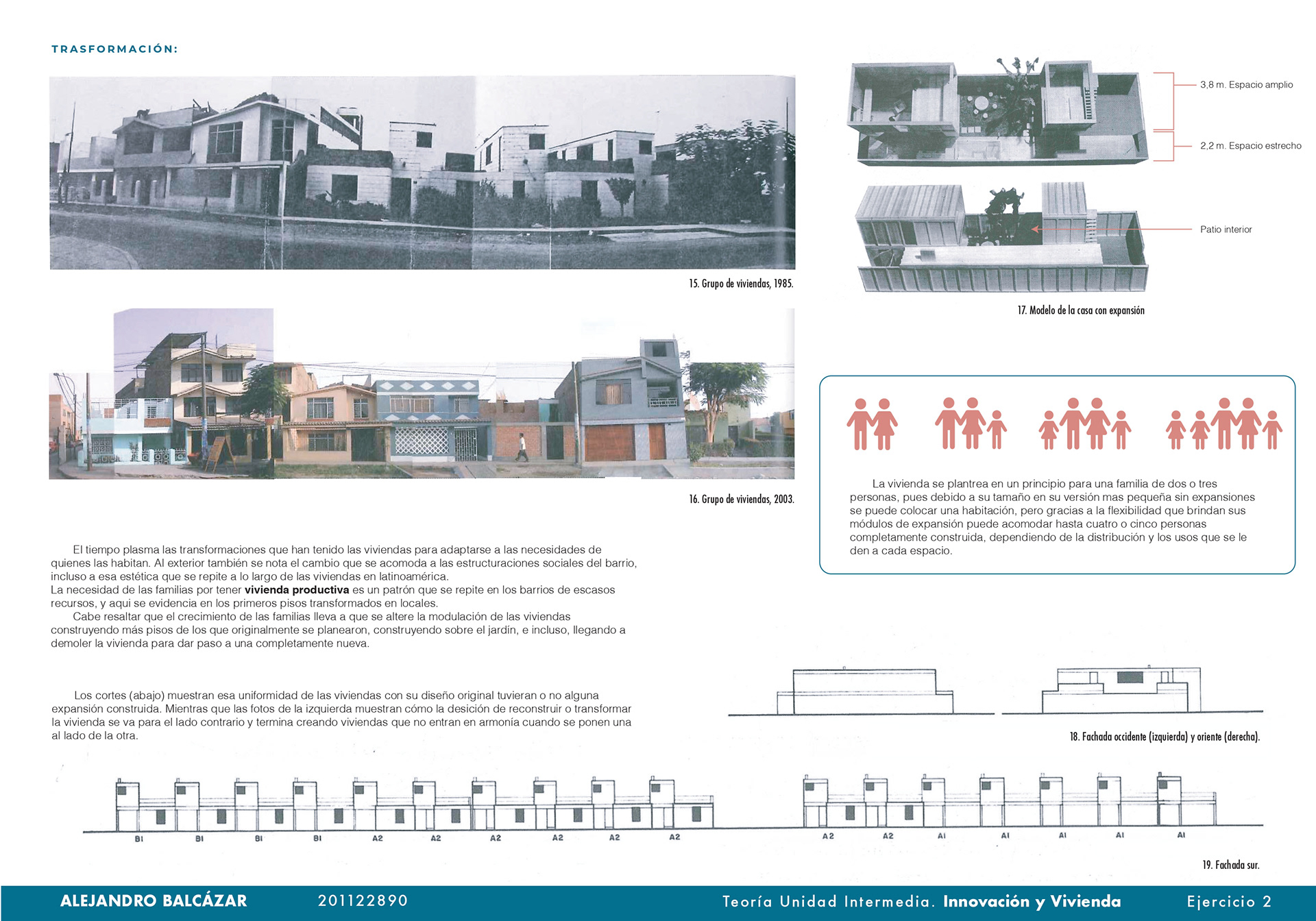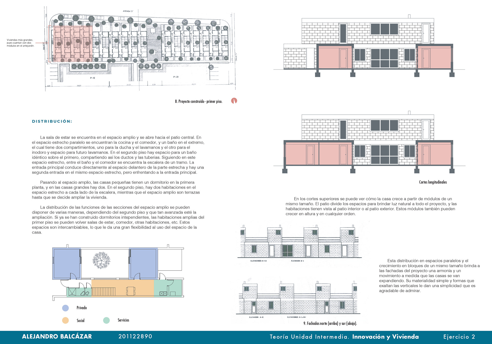 El curso de teorías de la unidad intermedia de Innovación y vivienda nos ayuda para analizar diferentes casos de estudio sobre vivienda de interés social a nivel nacional e internacional, los proyectos nos enseñan posibles soluciones de fachadas, diseño de espacios internos, desarrollo de la iluminación, ventilación y puntos fijos. También, se hizo un análisis de los perfiles de usuario y los equipamientos que se encontraban en el proyecto propuesto T+C. Para finalizar, se usaron las cartillas del Observatorio de vivienda para determinar los índices de escala intermedia y unidad, donde podíamos proponer nuevas soluciones para los problemas y observar donde estaba fallando nuestra propuesta.